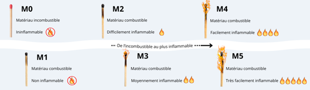 | M2 | Combustible | Difficilement inflammable | Moquette murale, panneau de particules |
