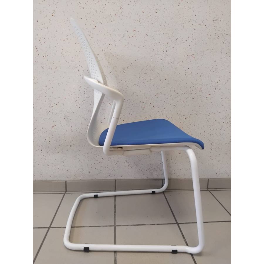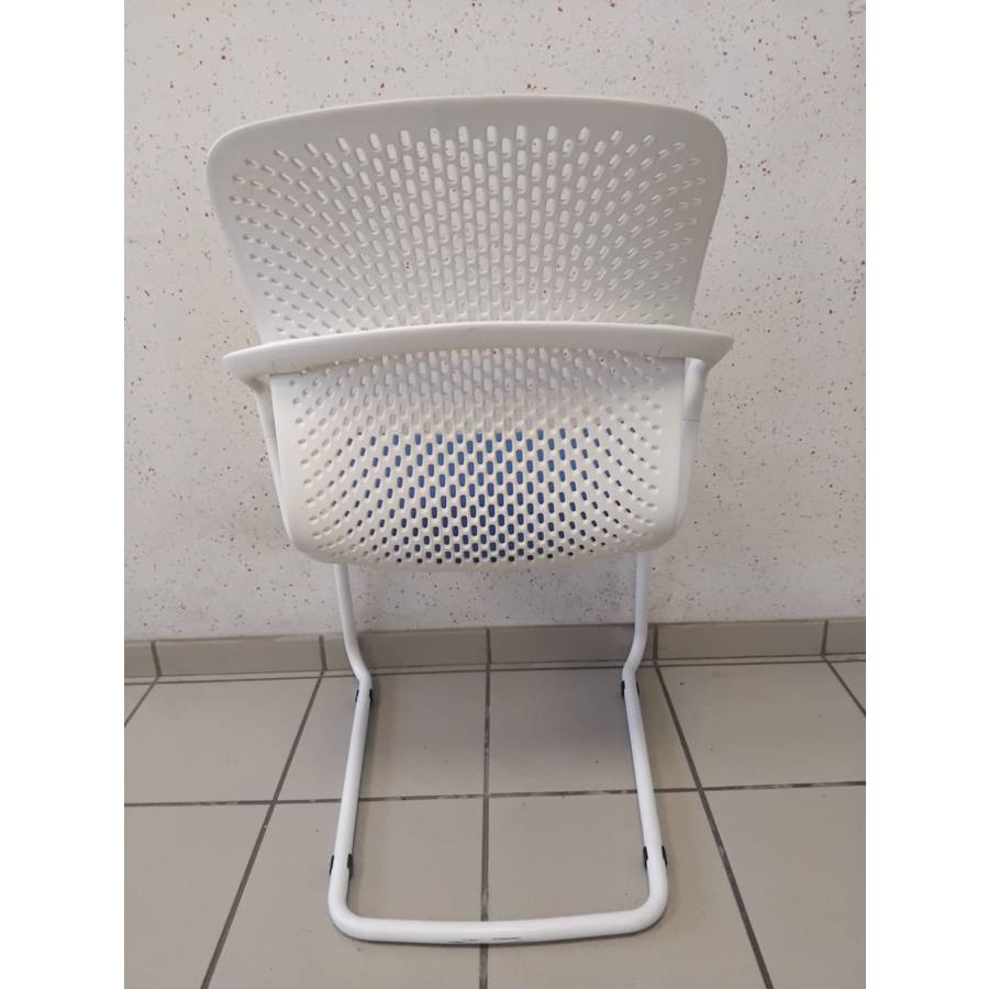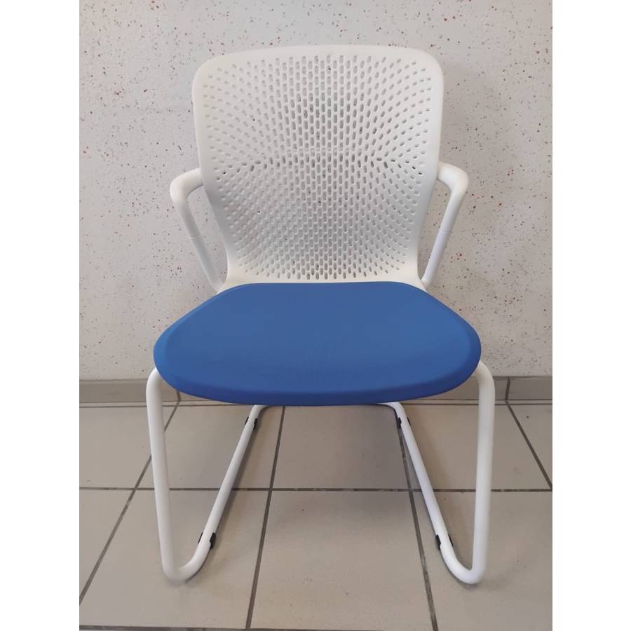 Fauteuil KEYN blanc assise bleue reconditionné - Herman MILLER