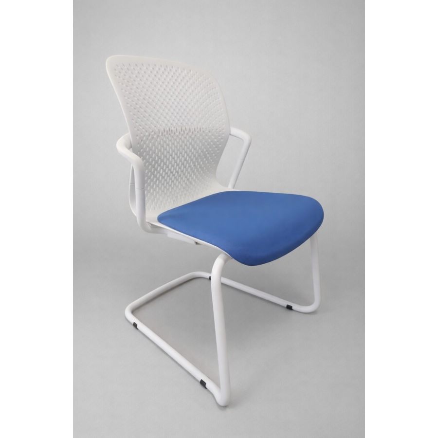 Sa structure blanche associée à un piétement luge blanc garantit une excellente stabilité tout en offrant une ligne élégante et aérienne. Les accoudoirs fixes assurent un bon maintien des bras pour un confort optimal lors des réunions ou des temps de travail prolongés.
