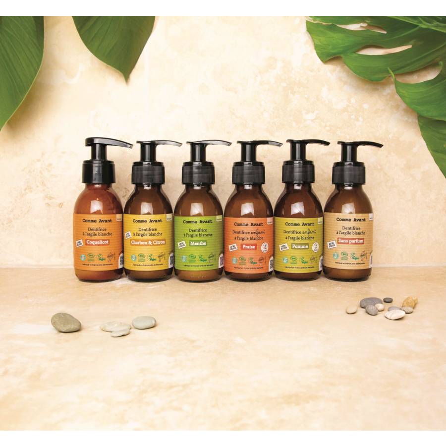 Fraise et Pomme dès 2 ans, Sans parfum dès 2 ans, Coquelicot dès 6 ans, Menthe et Charbon & Citron dès 7 ans.