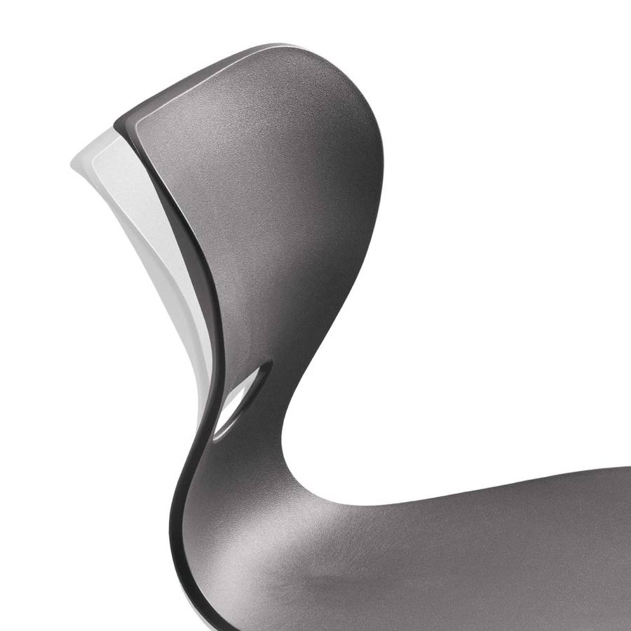 Assise ergonomique 3D : coque flexible double paroi en polypropylène, favorisant le mouvement et réduisant les tensions dorsales.