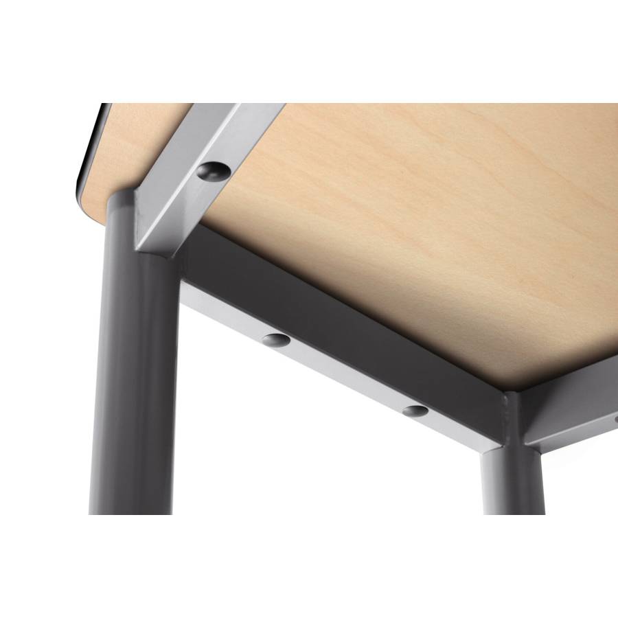 Plateau HPL robuste de 13 mm avec bordure de sécurité arrondie 4 mm, étanche, haute résistance aux chocs, aux liquides et solvants, certifications FSC/PEFC.