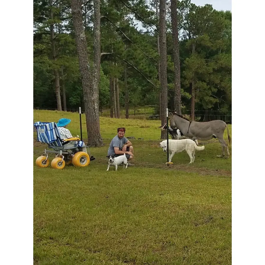 Le F2A Fauteuil PMR T-T® est un fauteuil roulant tout-terrain et plage conçu pour offrir aux personnes en situation de handicap et aux utilisateurs de fauteuils roulants une liberté de mouvement maximale dans tous les environnements extérieurs : sable, herbe, gravier, sol irrégulier. Son cadre en aluminium léger et acier inoxydable garantit robustesse et résistance à la corrosion, tandis que ses grandes roues en caoutchouc robustes — dont deux roues arrière pivotantes — assurent une maniabilité exceptionnelle sur tous types de surfaces. La capacité de charge atteint 136 kg (300 lbs), et le dossier propose trois positions d'inclinaison pour s'adapter au confort de chaque utilisateur. Pliable et démontable sans outil en quelques minutes, il se transporte aisément dans tout vehicule et se range facilement entre deux utilisations. Il est proposé en deux configurations : version plage (châssis elargi optimisé pour la poussée sur sable) et version tout-terrain (pour les chemins, parcs, événements extérieurs) — à sélectionner sur la fiche. Conçu et distribué par Fun2Access, référence de l'accessibilité en plein air depuis 2006.
