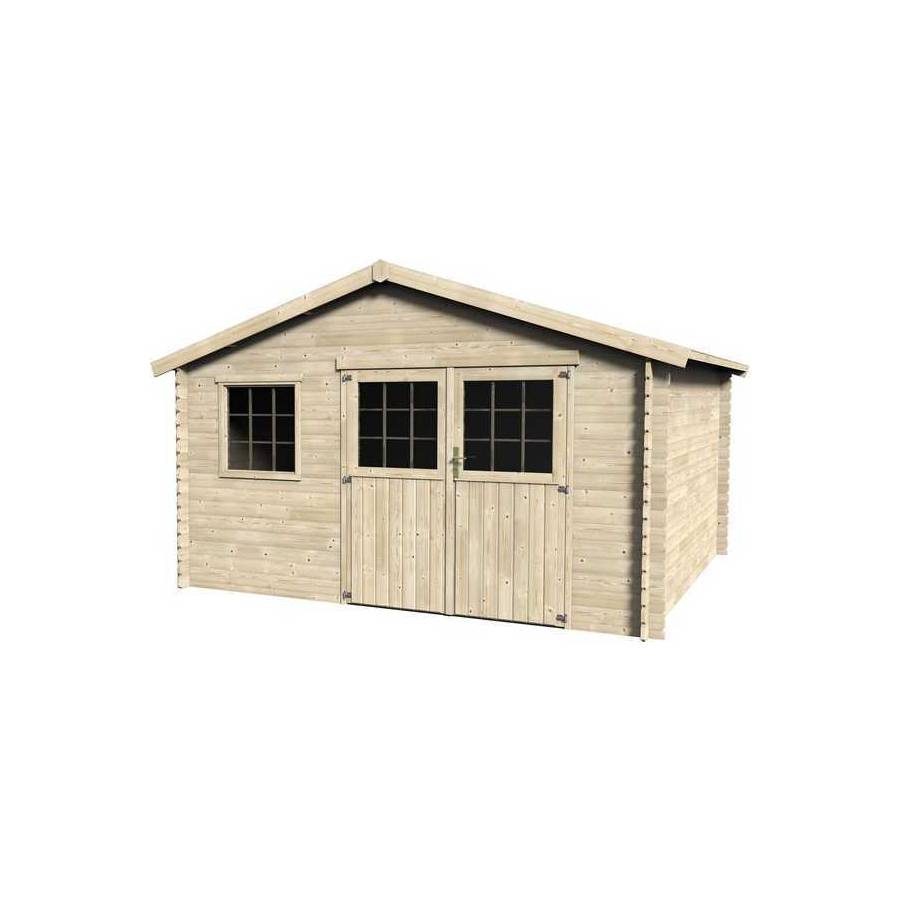 En sapin du Nord, naturel et prêt à traiter. Abri constitué de planches, madriers massifs de 28mm avec double entaillage. Montage par emboîtement des planches les unes dans les autres. Equipé d'une double porte avec serrure Haut. 173,4 x Larg. 167,4 cm et d'un vitrage synthétique transparent 1,5mm avec croisillons. D'une fenêtre à chassis fixe avec vitrage synthétique transparent avec croisillons. Le toit en bois massif volige de 16mm et recouvert toile bituminée noire. Dim. hors tout : Long. 427,3 x Prof. 330,5 x Haut. 251cm (14,10m²). Dim. intérieur : Long. 372 x Prof. 300 x Haut. 188cm (11,17). A monter soi-même. Toutes fournitures de montage comprises.