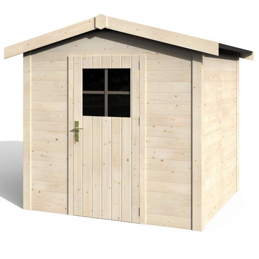 En sapin du Nord, naturel et prêt à traiter. Abri constitué de planches, madriers massifs de 19mm avec double entaillage. Montage par emboîtement des planches les unes dans les autres. Equipé d'une porte avec serrure Haut. 169 x Larg. 74,5 cm et d'un vitrage synthétique transparent 1,5mm avec croisillons. Le toit est constitué de panneaux en OSB de 14mm et recouvert toile bituminée noire. Dim. hors tout : Long. 216 x Prof. 214 x Haut. 212cm (4,62m²). Dim. intérieur : Long. 193 x Prof. 197 x Haut. 183cm (3,80m²). Seuil en bois. A monter soi-même. Toutes fournitures de montage comprises.