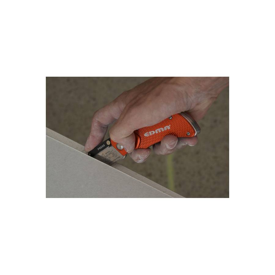 Couteau cutter pliable pour lame trapèze et lame crochet - Compartiment de rangement 4 lames - Avec étui de rangement accrochable à la ceinture.