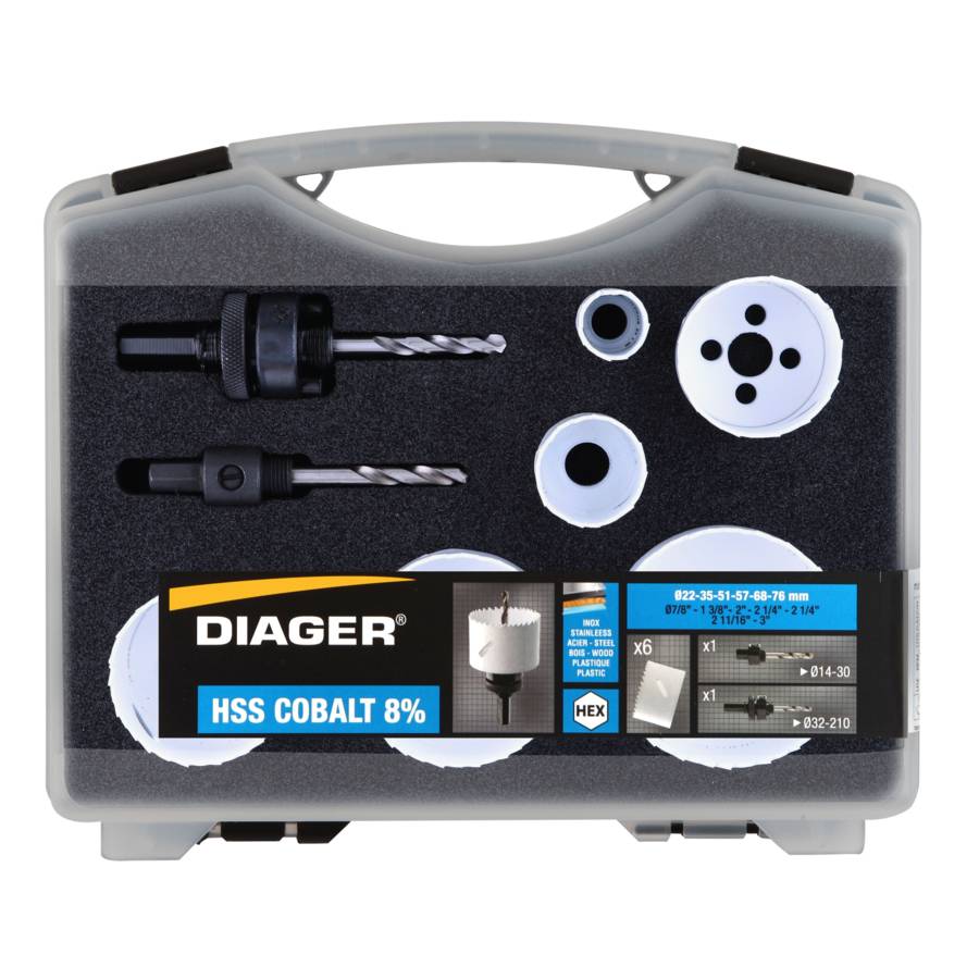 Voir plusMALLETTE SCIE CLOCHE 8 PCS COBALT 8% 22-35-51-57-68-76MM 2 ADAPTATEURS HEXA MALLETTE SCIE CLOCHE BI-METAL 8% COBALT - SPECIAL ELECTRICIEN I
