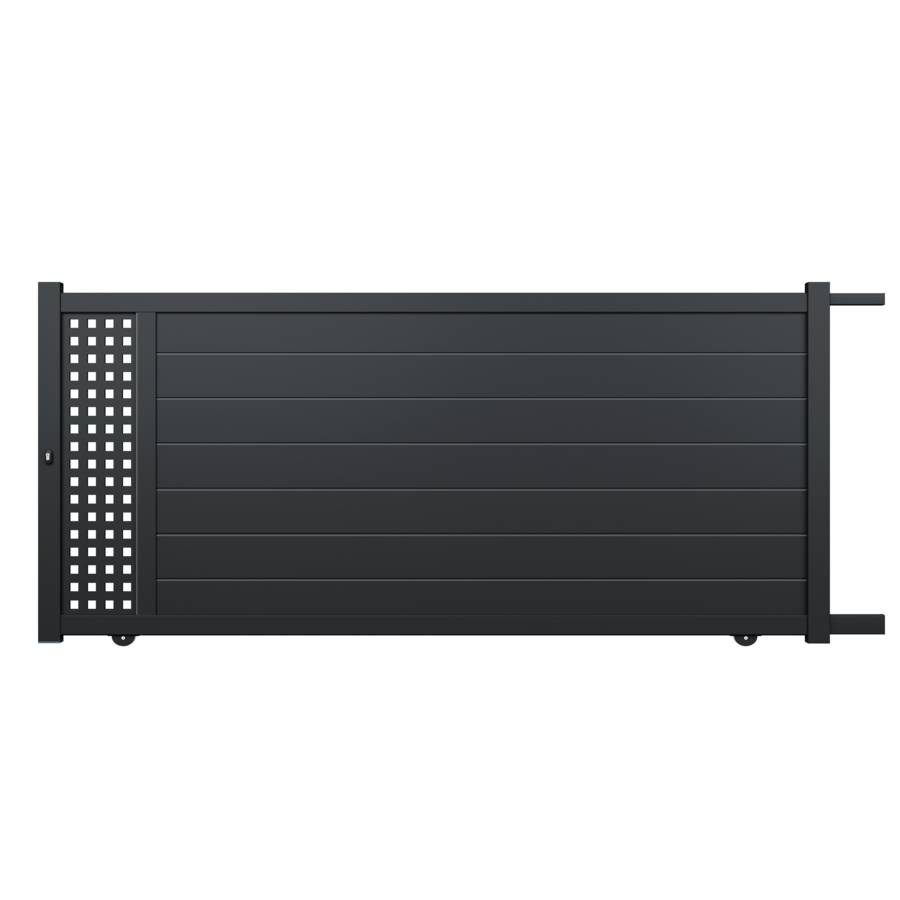 Aluminium contemporain assemblé. Gris anthracite RAL 7016 structuré. - Largeur entre piliers 4 m. - Décor tôle découpée laser. Lames horizontales de 200 mm. Montants 100 x 54mm. Traverses 90 x 36mm. - Proposé en version battante. - Motorisable. - Sur mesure possible atelier. - Délai express.