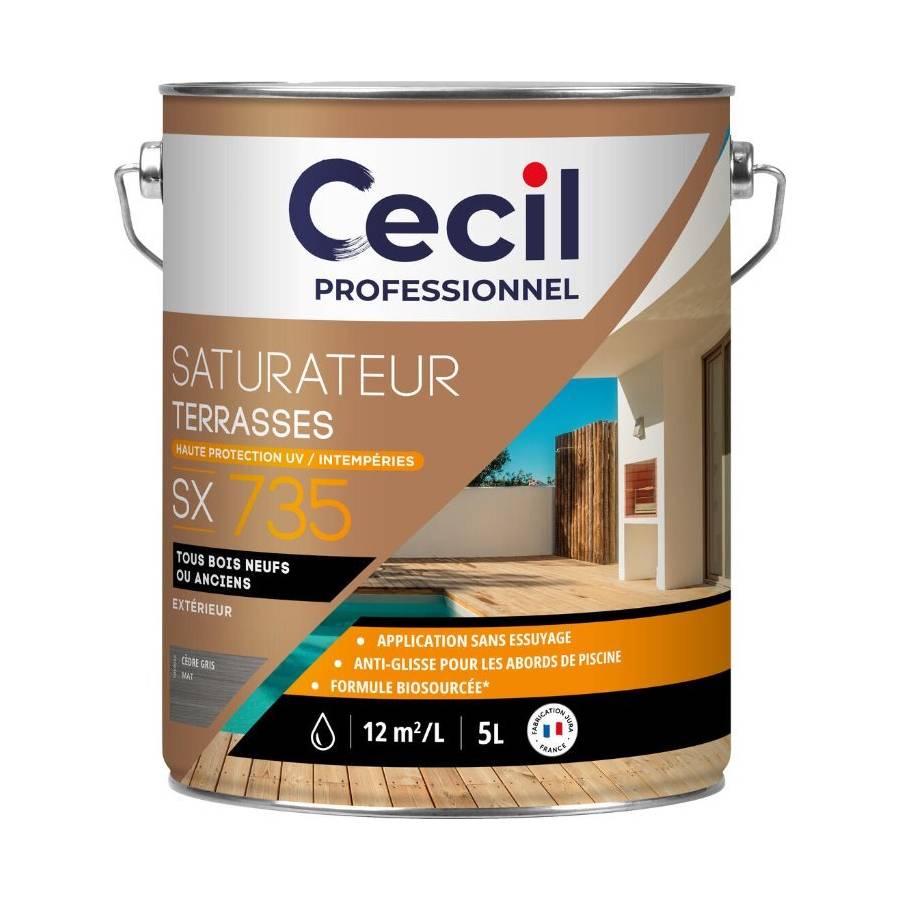 Saturateur destiné à la protection et la décoration des bois extérieurs horizontaux : terrasses, escaliers, deck de piscine, rambardes. Nouvelle formule biosourcée, à base d'huiles végétales et de résines modifiées biosourcées en phase aqueuse. Haute protection UV/Intempéries. Applications facile au rouleau sans essuyage
