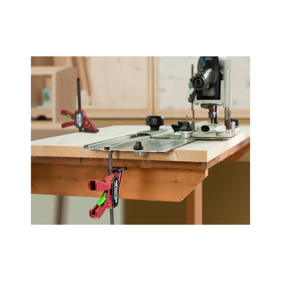Serre joint adapté à un travail efficace et rapide avec utilisation à une seule main, manche ergonomique. Têtes plates à insérer dans des fentes de 12x8 mm. Force maximale : 60 kg. Têtes en nylon et fibre de verre. Barre en acier au carbone trempé. Protecteurs en plastique inclus. Facile à utiliser d'une seule main. Chaussure en plastique sans huile. Ne laisse aucune trace.