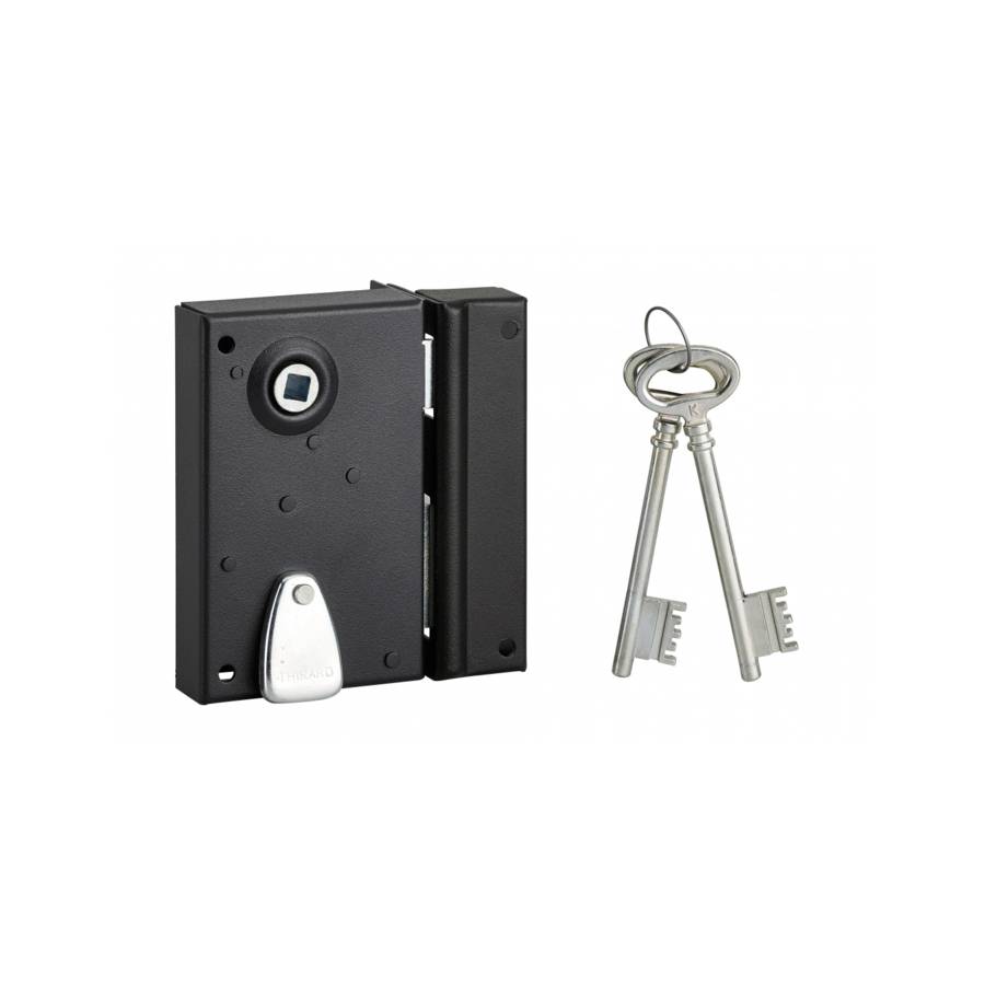 Coffre et gâche acier cambré - Pêne acier - Demi-tour acier - Canon alliage long. 40 mm - Mécanisme à 4 gorges 2 tours avec tirage ou à fouillot - Pêne 1/2 tour réversible pour porte ouvrant à l'extérieur - Carré 7 mm - 2 clés nickelées - 12 variures - Entrée de clé et de fouillot acier - A TIRAGE : Rappel du demi-tour par la clé - Finition : Epoxy noir granité - Version : A tirage - Droite et gauche.