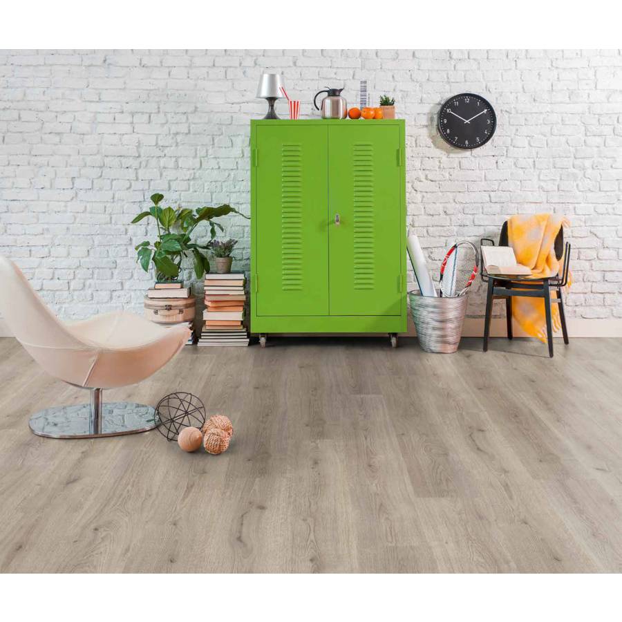 Support HDF. Finition de surface aspect bois. Facilité d'entretien et antistatique. - Compatible sol chauffant réversible. Assemblage clic angulaire. - Classe 31. Résistance à l'abrasion AC3. - Lames à bords droits de 1376 x 193 x 7 mm. Colis 2,39 m².