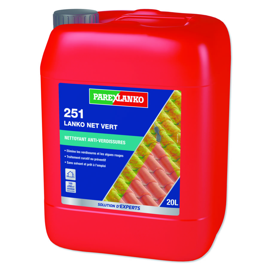 L'agent 251 Lanko Net Vert s'applique sur les bâtiments tels que les pignons, murs de façades, toitures, terrasses, balcons et également sur les dallages, allées, murs de clôtures, statues et balustres. Permet l'application de revêtements ultérieurs après rinçage.