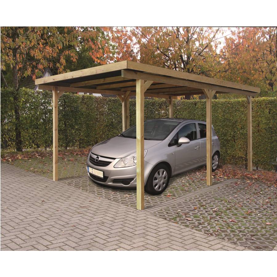 Structure et charpente en pin traité autoclave. Autoportant, ce carport repose sur 6 poteaux de 9x9cm à fixer ou sur dalle ou à sceller dans le sol. Doté d'une toiture en tôle PVC noire. Surface couverte : 15m². Passage Larg. 266 x Haut. 201cm. Largeur entre chaque poteaux : 201cm. Traverses 4x10cm. haut. totale : 220cm.