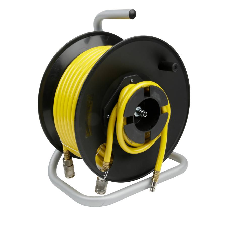 Dévidoir manuel tuyau 8 x 12 - 20 mètres. Sous le format pratique d'un enrouleur de prise électrique, ce dévidoir dispose d'un tuyau en PVC jaune d'une longueur de 20 mètres pouvant supporter une pression allant jusque 10 bar. Equipé de raccords rapides. Garantie 6 mois Norme CE