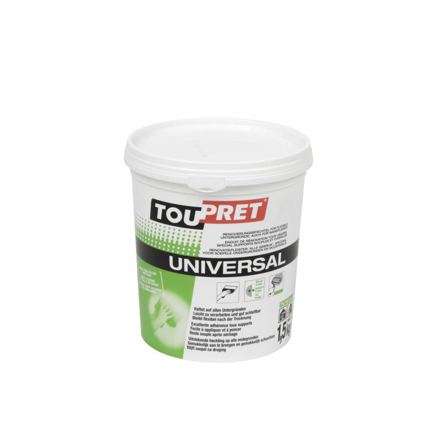 Enduit de rénovation tous usages spécial supports souples et carrelés, Idéal cuisine et salle de bains, Excellente adhérence tous supports, 2 en 1 : Garnissant - Lissant, Facile à appliquer et à poncer, reste souple après séchage, Consommation : environ 1,6 kg.m2.mm., Temps d'utilisation : sans limite., Adhérence enduit.support (EN 16566) : supérieur à 0.8 Mpa.