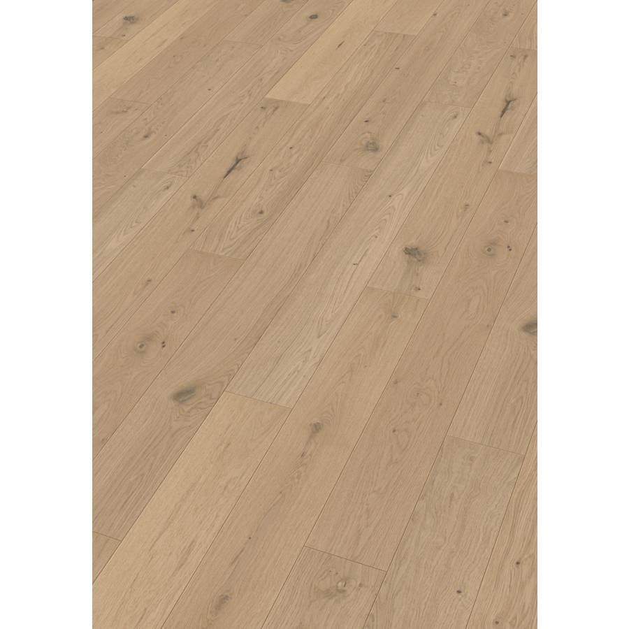 Parement monolame chêne nature épaisseur 2,5 mm. Choix rustique. Finition verni mat. Support HDF contrebalançé. Assemblage multiclic. Fabrication allemande. - Lames 4 chanfreins de 1187 x 142 x 13 mm. Colis de 1,011 m2.