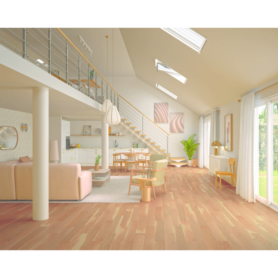 Chêne 3 frises à l'anglaise parement 2,7 m. Verni mat. Support contrebalancé âme lattée en bois sur quartier. - Assemblage double clic. Double verrouillage mécanique. Pose flottante et/ou collée. - Lame sans chanfrein. Fabrication Autrichienne. -- Colis de 2,57 m².