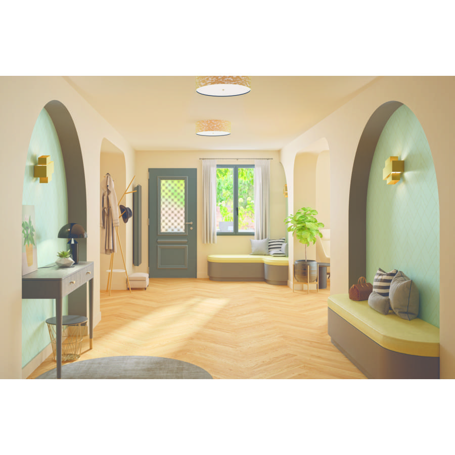 Chêne brossé 2 plis. Bâton Rompu. 2,7 mm de parement. Verni mat. Support HDF - Assemblage rainure et languette. Pose collée. Lames sans chanfreins à chevrons. Fabrication Autrichienne. -- Colis de 2.72 m².