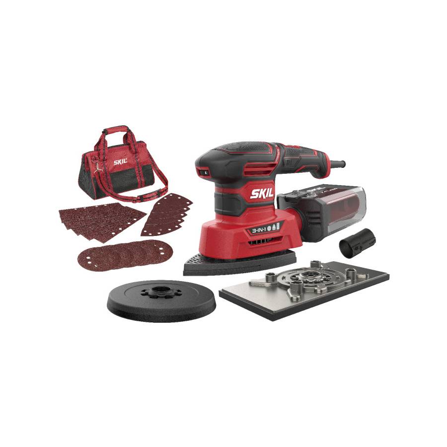Ponceuse multifonction SKIL 7280 - Sac de transport - 15 feuilles abrasives - Plateau excentrique - Plateau vibrant - Plateau triangulaire - Pointe delta pivotante - Boîtier collecteur de poussières X-Flow - Adaptateur d'aspiration.