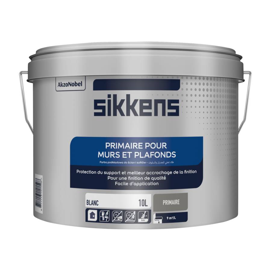 Primaire pour murs et plafonds, en phase aqueuse, pour l'intérieur. Ce poduit contient au maximum 1 g/l COV. Rendement de 8 à 10m² par litre en fonction de la nature des fonds et du mode d'application : brosse synthétique, rouleau polyester tissé ou polyamide texturé de 13mm ou au pistolet pneumatique et Airless. Sec au toucher en 1 heure et recouvrable après 6 heures - Pot de 10l.
