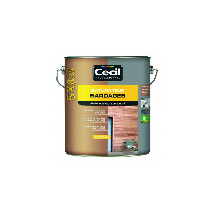 SX835 est un saturateur destiné à tous les bois verticaux extérieurs et intérieurs: bardage, brises vues, abris de jardin, volets, lambris… Il offre une accroche parfaite sur les essences de bois utilisées en extérieur : bois exotiques, feuillus, résineux, bois autoclavés, bois de bardage… Sa formule renforcée en anti-UV assure une protection très longue durée contre UV et intempéries même en conditions extrêmes (mer/montagne). Le bois est protégé contre le grisaillement et le fendillement. Son bel aspect MAT permet de conserver l'aspect et le toucher du bois brut. Sa palette de teintes naturelles ou métallisées offre de nombreuses possibilités décoratives. Sa texture anti-goutte permet une application facile sans coulures même en vertical et une excellente glisse sous le pinceau. Son application sans essuyage et son séchage rapide permettent d'optimiser le temps de chantier. Il ne s'écaille pas pour un entretien facile par simple ré-application.