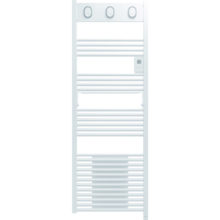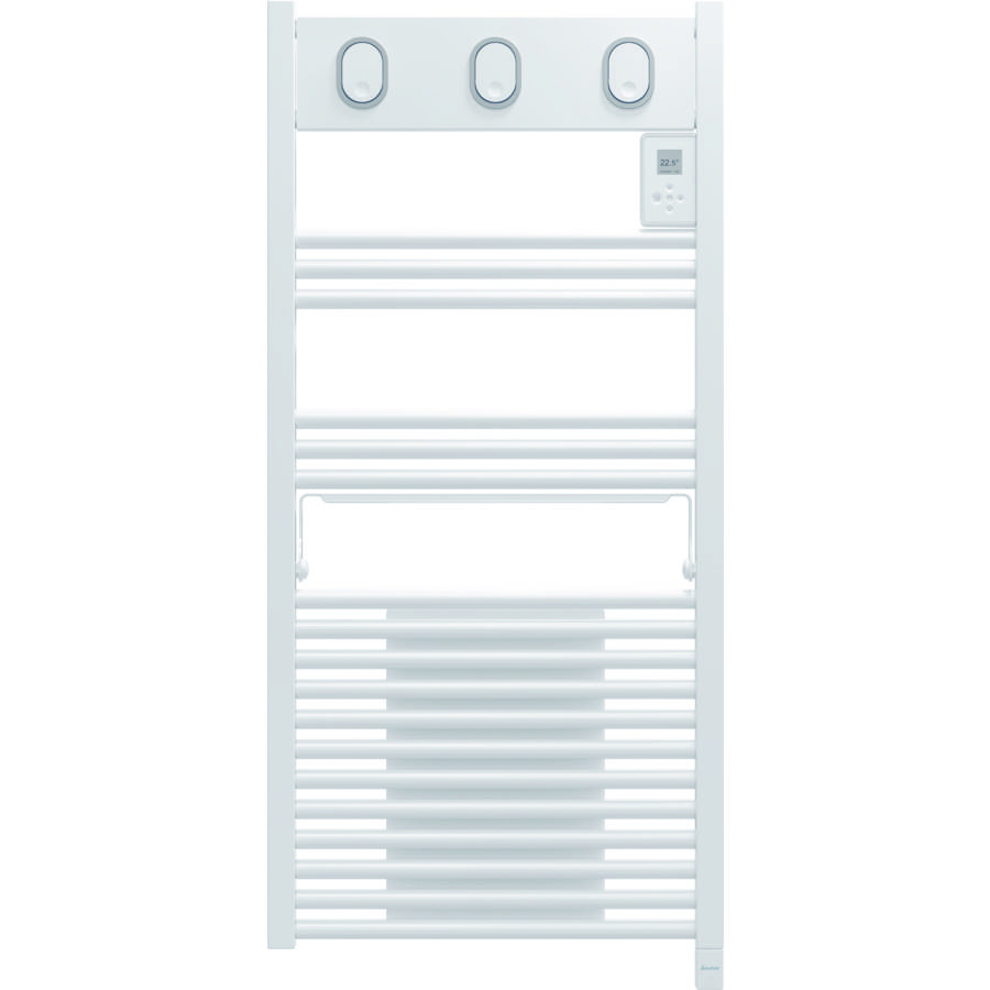 Sèche-serviettes à inertie fluide - Format lames : rondes et droites - 4 accessoires malins rétractables: 3 patères et 1 barre - Boîtier de commande à hauteur des yeux avec touches tactiles et affichage de l'heure - Fonction Boost pour une montée en température rapide - Programmation libre - Confort 3CS® : chauffe la salle de bains même recouvert de serviettes.