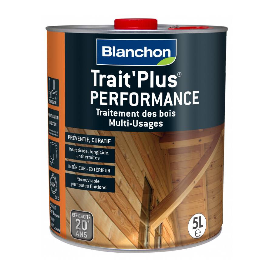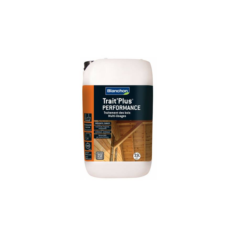 Trait'Plus® MU Blanchon est destiné à la protection préventive de toutes les boiseries, grâce à sa formule extrêmement pénétrante et sa capacité à fixer durablement des principes actifs dans le support - Il est incolore, non gras et sans odeur et ne modifie pas l'aspect du bois - Rendement : 5 m²/L/couche - Séchage entre couches : 15 minutes - Séchage hors poussières : 1 à 2 heures - Nettoyage du matériel : utiliser de l'eau et du savon doux - Pot 1l.