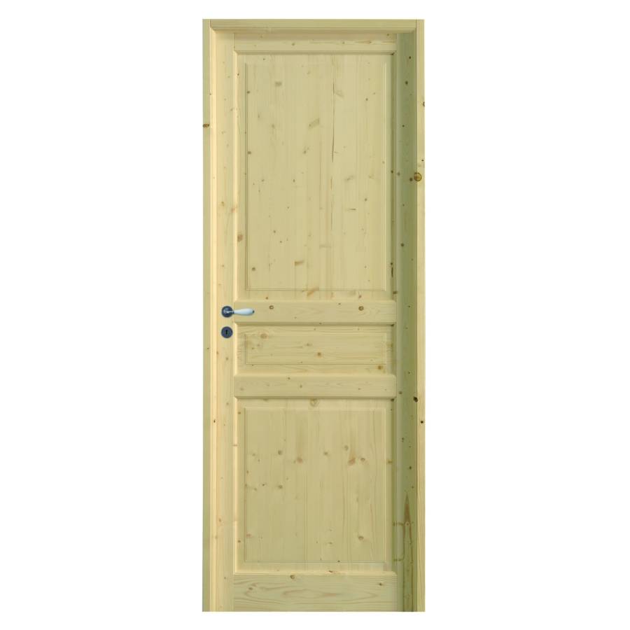 Bloc-porte massif à recouvrement en épicéa lamellé collé épaisseur 39,5mm - Ferrage par 3 fiches - Serrure à penne dormant demi-tour axe 40mm - Huisserie 72mm en bois massif à coupes d'onglet pour cloisson de 50mm - Finition brute - Pose traditionnelle - poignée vendu séparément ( voir catalogue pages 160 à 161) - Dimensions totales du bloc-porte: Hauteur +3,7 cm - Largeur +5,2 cm.