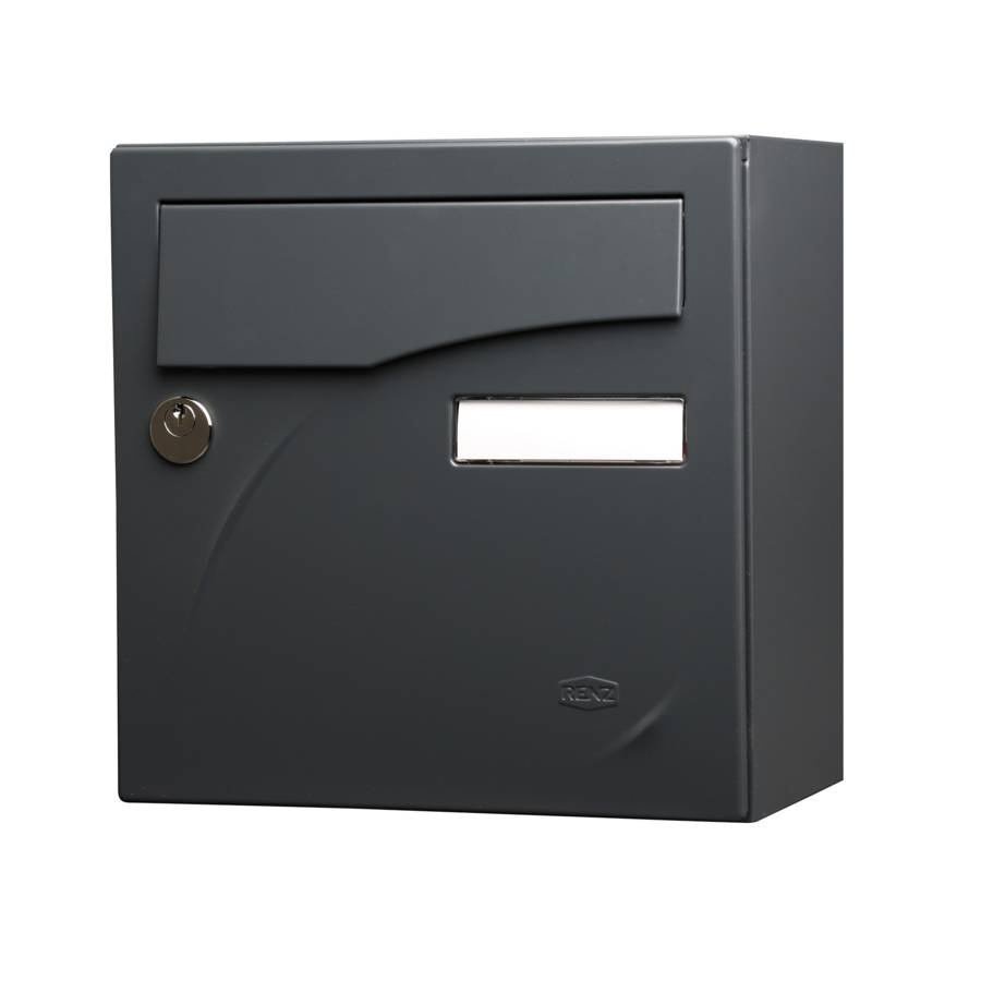 Boîte aux lettres Renz Préface compact avec décor, gris anthracite 7016M. Boitier avec gouttière hydrofuge. Design grain de café et porte-nom affleurant en polycarbonate. Serrure normalisée avec 2 clés. Plancher ergonomique pour un retrait facile du courrier. Peinture poudre polyester sans plomb. Garantie anti-corrosion de 15 ans. Anti-vandale grade 3, résistant jusqu'à 60 kg d'arrachement. Certifiée loi handicap. Dimensions : 285x285x150mm.