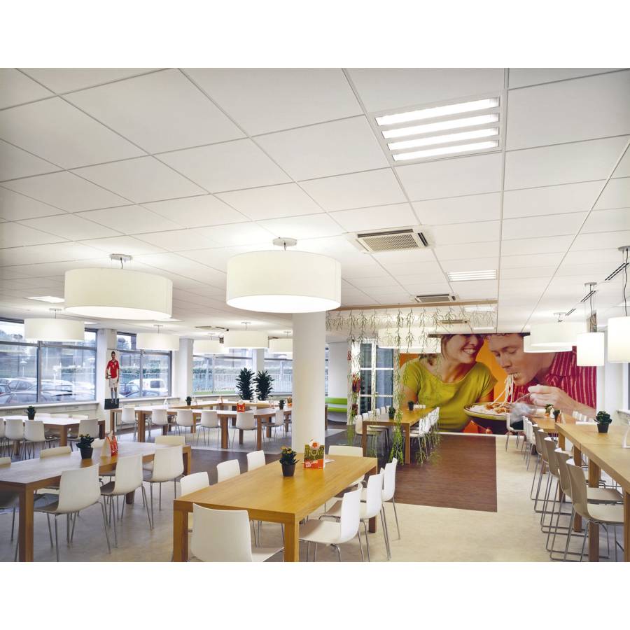 Dalle de plafond blanche, surface légèrement texturée et microperforée. Bord feuilluré de 24 mm. - Bonne absorption acoustique (0,60 αw) - Atténuation latérale Dn,f,w = 34 dB - Bonne réflexion de la lumière (85%) - Résistance à l'humidité 95%. - 16 dalles par colis soit 5,76M².