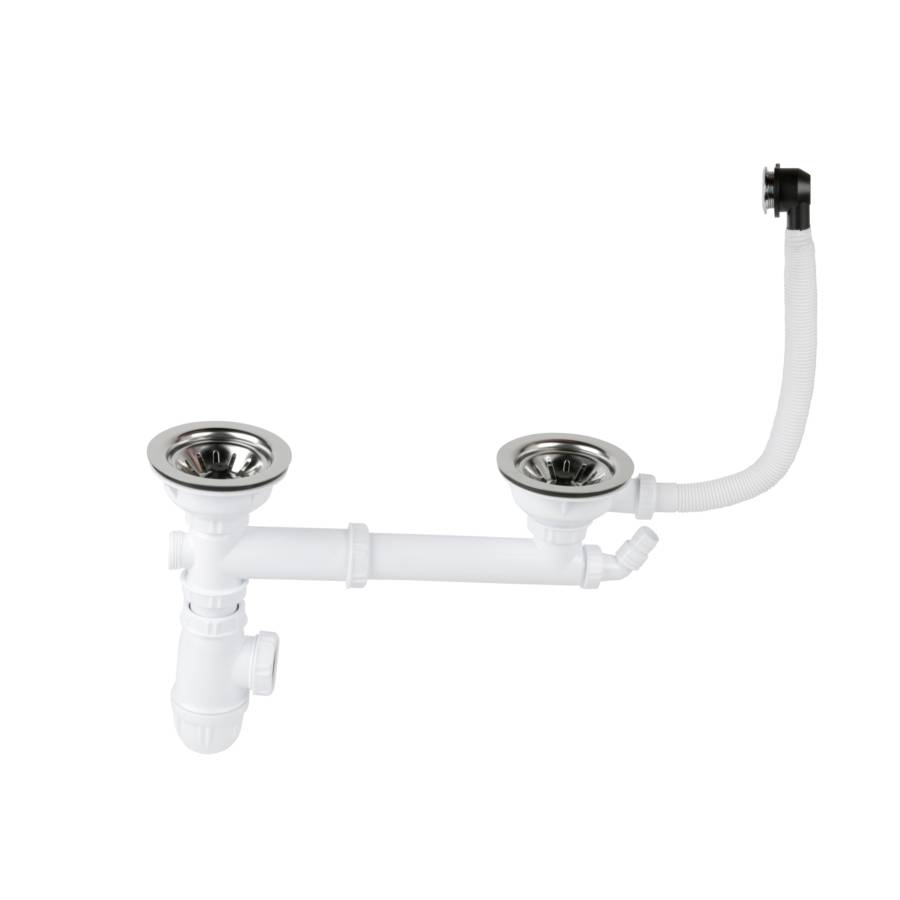 L'équipement complet pour évier 2 bacs en synthèse percés en diamètre 90 mm avec trop plein, compose de 2 bondes à panier manuel en inox diamètre 114 mm. Le tube de trop plein est fourni avec grille rectangle et grille ronde. La tubulure de raccordement est ajustable de 160 à 360 mm suivant l'écartement entre les 2 orifices et est équipée d'une prise machine à laver. Le siphon est réglable en hauteur de 62 à 97 mm.