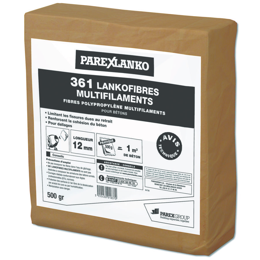 Fibres polypropylène multifilament utilisées pour les dallages et destinées à être incorporées aux bétons. Limitent les fissures de retrait plastique. Bonne résistance aux agents chimiques et à la corrosion. Consommation : 1 sachet de 500 g pour 1 m3 de béton.