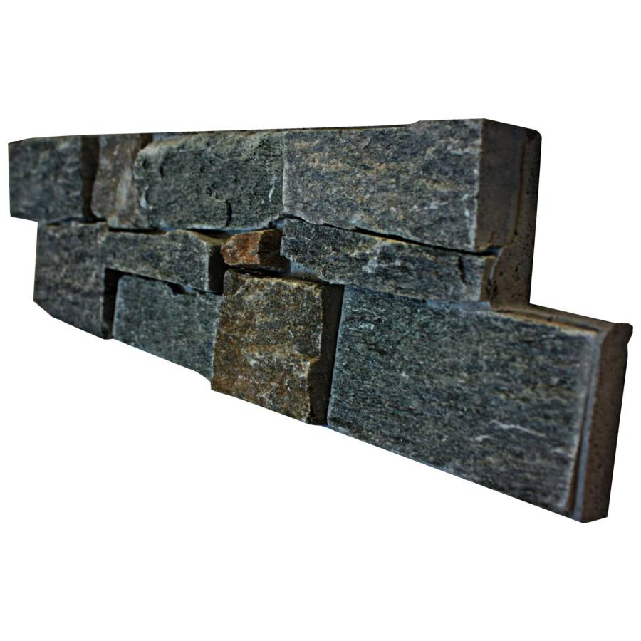 Plaquette de parement format ''Z''. Base ciment. - Quartzite grise nuancée. - Dim.15 x 55/60 x 2-4 cm. - Poids : 77 kg/m². - Boîte de 4 pièces soit 0,34 m².