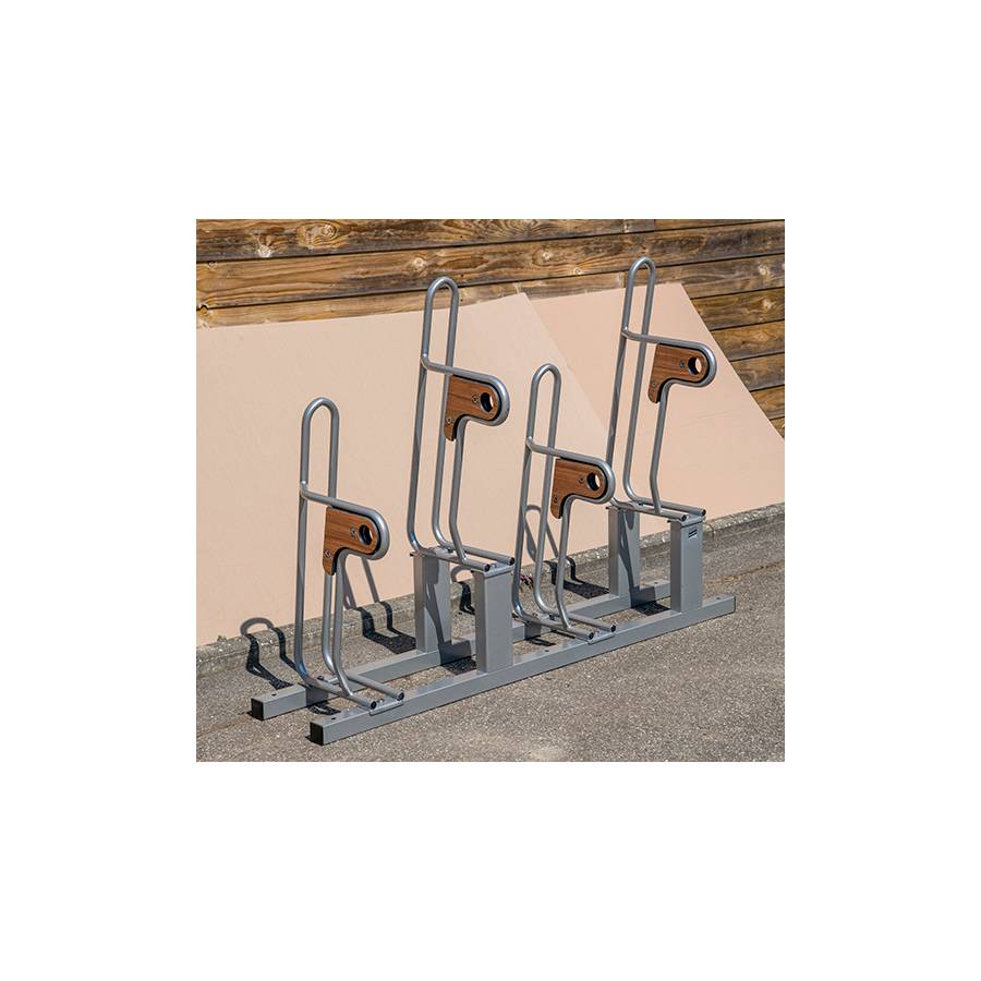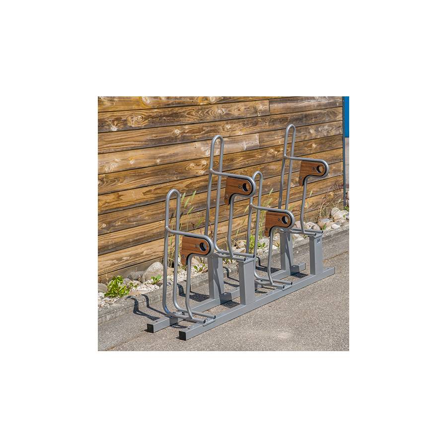 - d’appuyer le vélo en 3 points sans abîmer ni la jante, ni le cadre, grâce à la forme de l’arceau* et à la double plaque de HPL.