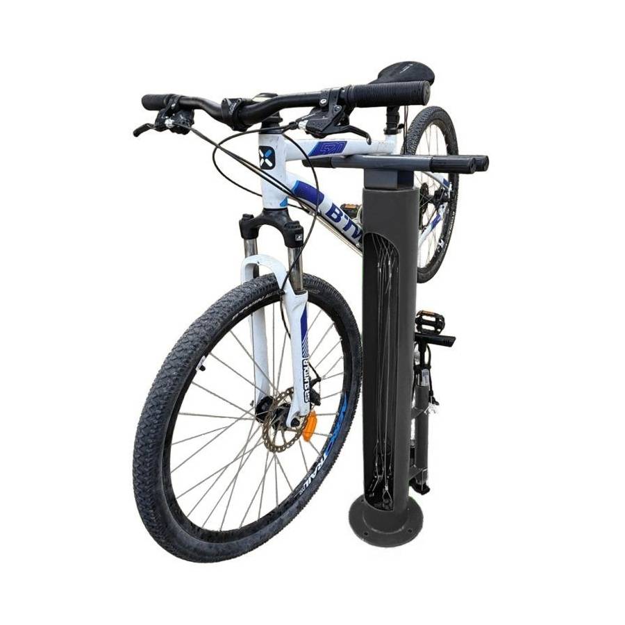 La station de réparation VELOREP'® est un équipement essentiel pour les communes, permettant d'effectuer facilement les réparations courantes grâce aux outils inclus. Elle peut accueillir deux vélos simultanément.