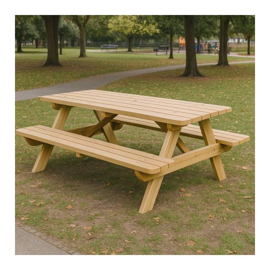 La table pique-nique en bois est un modèle robuste et convivial, idéale pour l'aménagement des espaces verts, de jardins, de parcs et de zones de détente. Conçue pour les environnements extérieurs, elle peut accueillir jusqu'à 8 personnes. Disponible en version standard ou PMR.