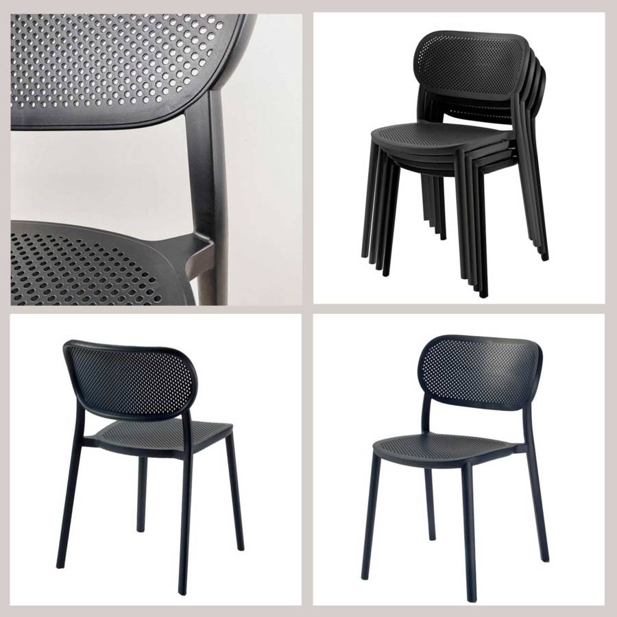 - Matériau : plateau en bois aggloméré avec placage stratifié très résistant - piétement en fonte de fer sablée et ébarbée - chaises en polymère, empilables