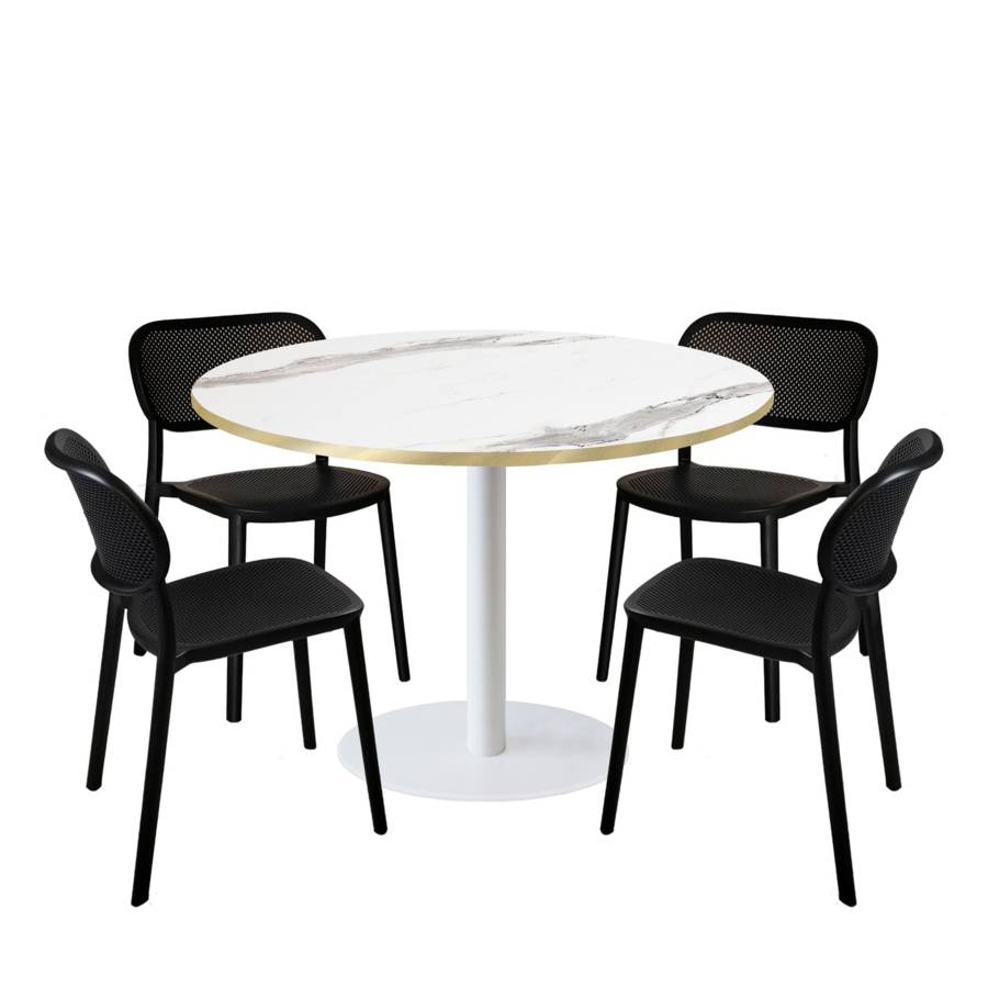 Lot table Ø120cm & 4 chaises - pied blanc plateau marbre blanc chants laiton | mobilier collectivités
