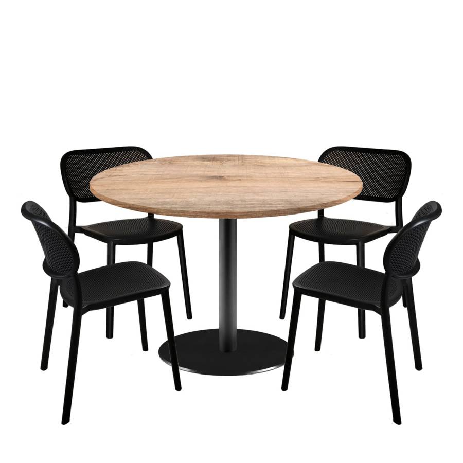 Lot table Ø120cm & 4 chaises - pied noir plateau bois tanin naturel - intérieur - RestooTab