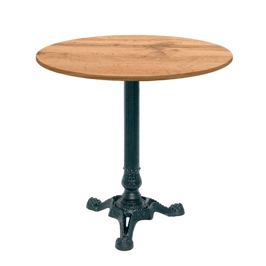 - Matériau : plateau en bois aggloméré avec placage stratifié très résistant - piétement en fonte de fer sablée et ébarbée, peinture époxy en poudre, traitée à haute température
