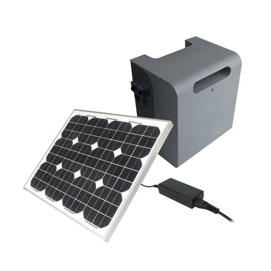 Le SYKCE30 est un kit d'alimentation solaire de la marque NICE, conçu pour alimenter les systèmes d'automatisation de portails, portes de garage et barrières levantes sans connexion au réseau électrique. Le kit comprend un panneau photovoltaïque SYP30 de 30Wp, un caisson de batterie PSY24 avec circuit de contrôle de la recharge et un bloc d'alimentation SYA1 permettant d'effectuer une recharge secteur.