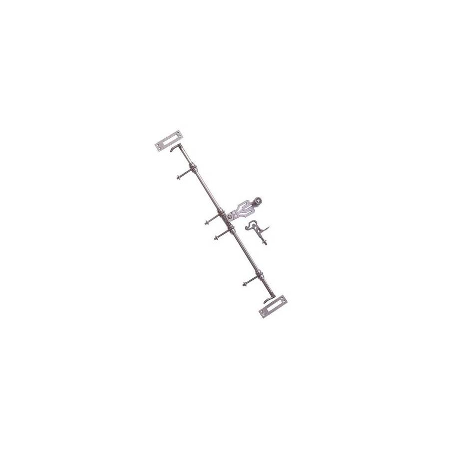 Espagnolette de croisée, montage à l'ancienne à lacetsfermeture par rotation avec crochet courbe et gâche.