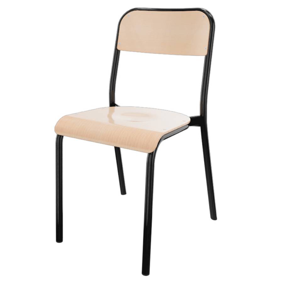 Chaise empilable par 4.|Dossier encastré ép.7 mm en multiplis hêtre finition Blueprotech®.|Assise appliquée avec cuvette ép.8 mm en multiplis hêtre finition Blueprotech®.|Piètement soudé et composé de tube en acier D25 mm ép.1,2 mm, poutre de renfort arrière D30 mm peint poudre époxy.|Contact au sol sur embouts non tachants et non marquants en polyéthylène coloris noir.
