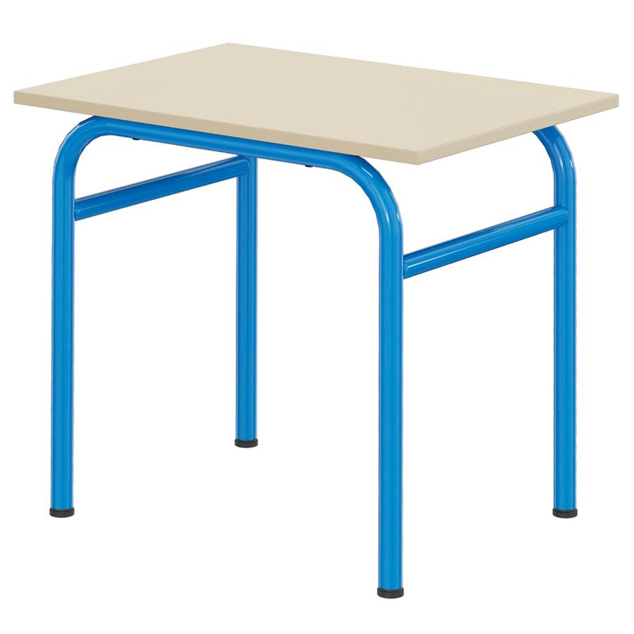 Cette table est à quatre pieds. Les pieds en tube acier, revêtu époxy sont fixés par vis au plateau, et sont soudés entre eux par soudure éléctrique pour une solidité optimale. Plateau mélaminé, chant ABS. Les pieds sont équipés d'embouts à talons, non-marquants et non-tachants. Il est possible d'ajouter en options un crochet porte cartable par personne.