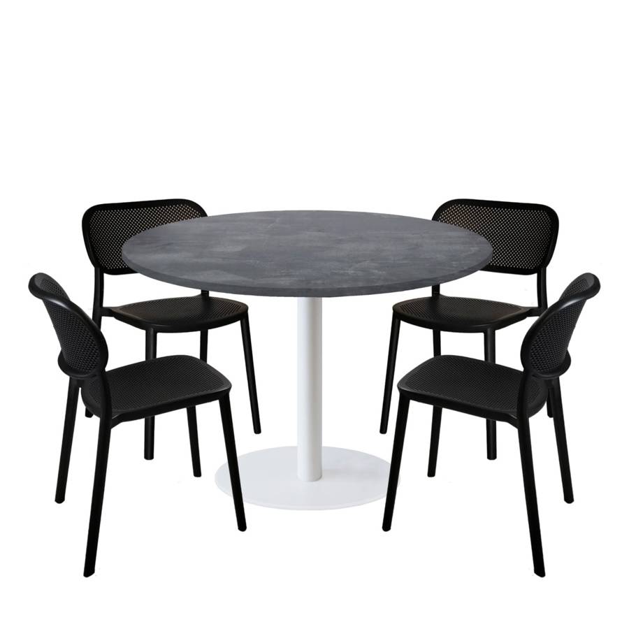 Lot table Ø120cm & 4 chaises - pied blanc plateau ardoise métallisée - intérieur - RestooTab