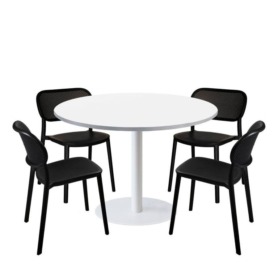 Lot table Ø120cm & 4 chaises - pied blanc plateau blanc chants inox - intérieur - RestooTab