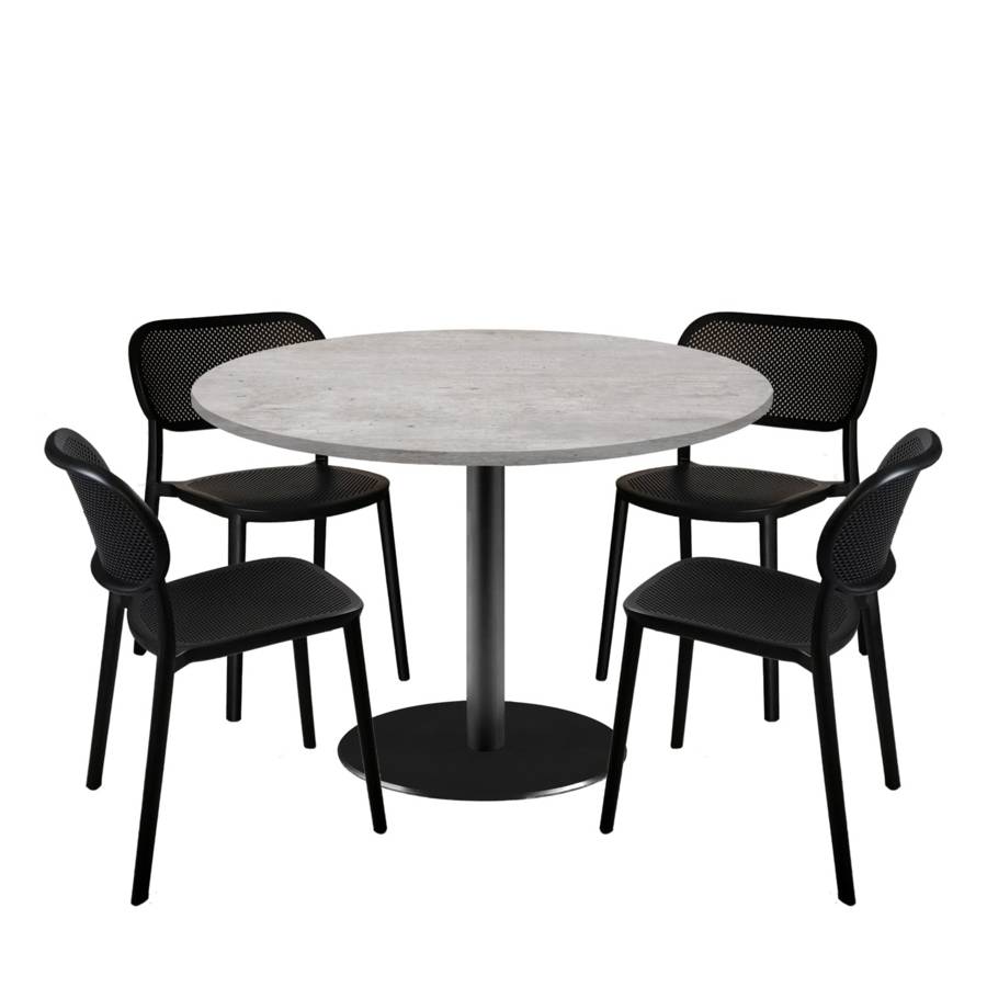 Lot table Ø120cm & 4 chaises - pied noir plateau béton naturel - intérieur - RestooTab