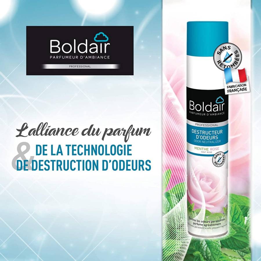 Absorbe, neutralise et détruit immédiatement les mauvaises odeurs sans les masquer Pulvérisation sèche : sans retombées humides Efficacité longue durée Parfum fleurs boisées Les aérosols Boldair destructeurs d'odeurs sont conçus pour détruire les molécules contenues dans les mauvaises odeurs. Absorbe, neutralise et détruit immédiatement les mauvaises odeurs sans les masquer. Destructeur d'odeurs & parfumant : libère un léger parfum très agréable tout en détruisant les mauvaises odeurs. Formulation professionnelle qui garantit une pulvérisation sèche sans retombées humides. Efficacité longue durée