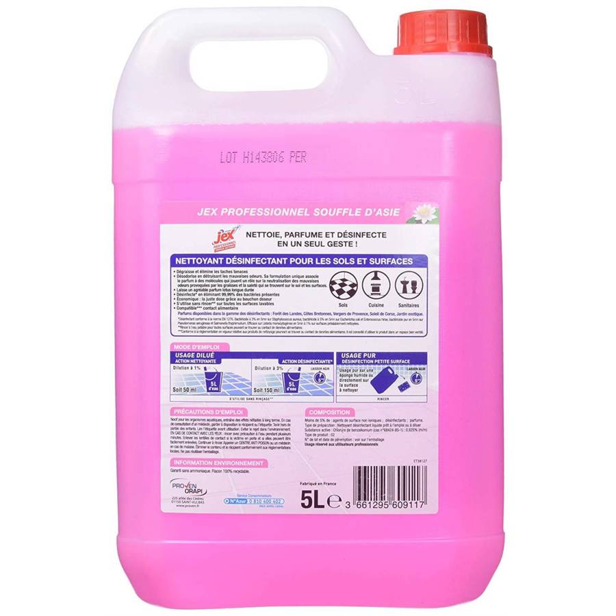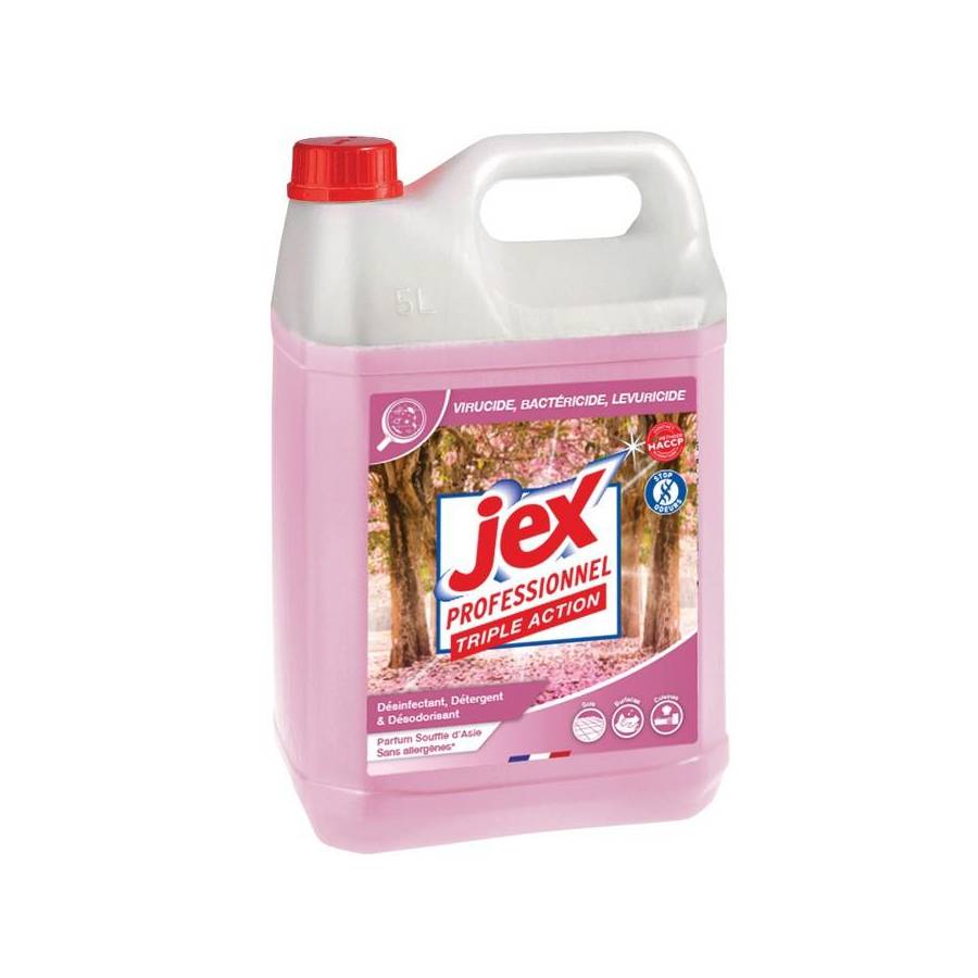 Voir plusNettoyant multi-usages désinfectant pour les sols et surfaces Nettoie, parfume et désinfecte : TRIPLE ACTION Bactéricide, levuricide et virucide Elimine les virus du COVID-19 Compatible contact alimentaire*** Parfum longue durée Parfum sans allergènes* TRIPLE ACTION : nettoie, parfume et désinfecte en un seul geste Multi usages : tous sols et toutes surfaces Large spectre de désinfection : Bactéricide : EN1276 et EN13697 en 5 min Lévuricide : EN1650 et EN13697 en 15 min Virucide : EN14476 entre 1 à 15 min selon la dilution et l'activité souhaitée Elimine les virus du COVID 19 Dégraisse et élimine les taches tenaces Spécialement conçu pour détruire toutes les mauvaises odeurs sans les masquer en laissant un parfum agréable de longue durée. La formulation unique des Jex Triple Action Stop Odeurs, associant le parfum à des molécules, joue un rôle sur la neutralisation des mauvaises odeurs provoquées par les graisses et la saleté qui se retrouvent sur les sols et les surfaces. S'utilise sans rincer ** sur toutes les surfaces lavables Compatible contact alimentaire pH : 10 Formule respectueuse : sans conservateurs, sans EDTA, parfum sans allergènes *, formule non étiquetée après dilution Information environnement : garanti sans ammoniaque, flacon 100% recyclable